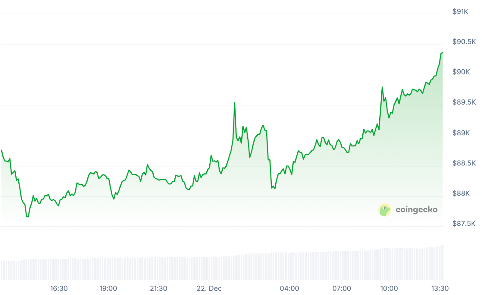 Alors que la fin de l’année approche, la tension monte : terminerons-nous avec une percée ou une déception ? Le Bitcoin (BTC) a en tout cas repris du terrain aujourd’hui, franchissant de nouveau la barre cruciale des 90 000 dollars.