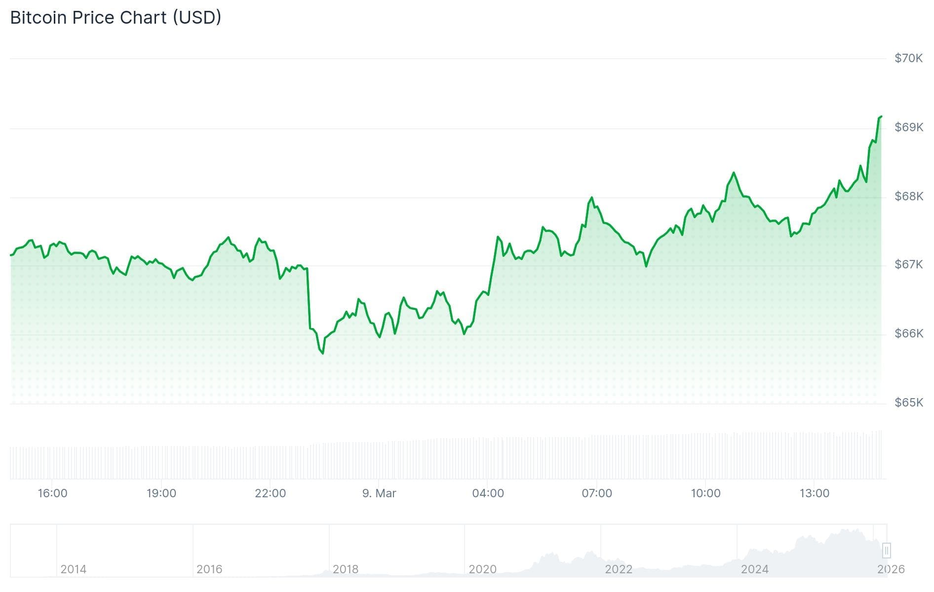 Le cours est passé de 68 200 dollars à 69 300 dollars. Cela signifie une augmentation de 5 % aujourd’hui, la journée ayant commencé à 66 000 dollars.