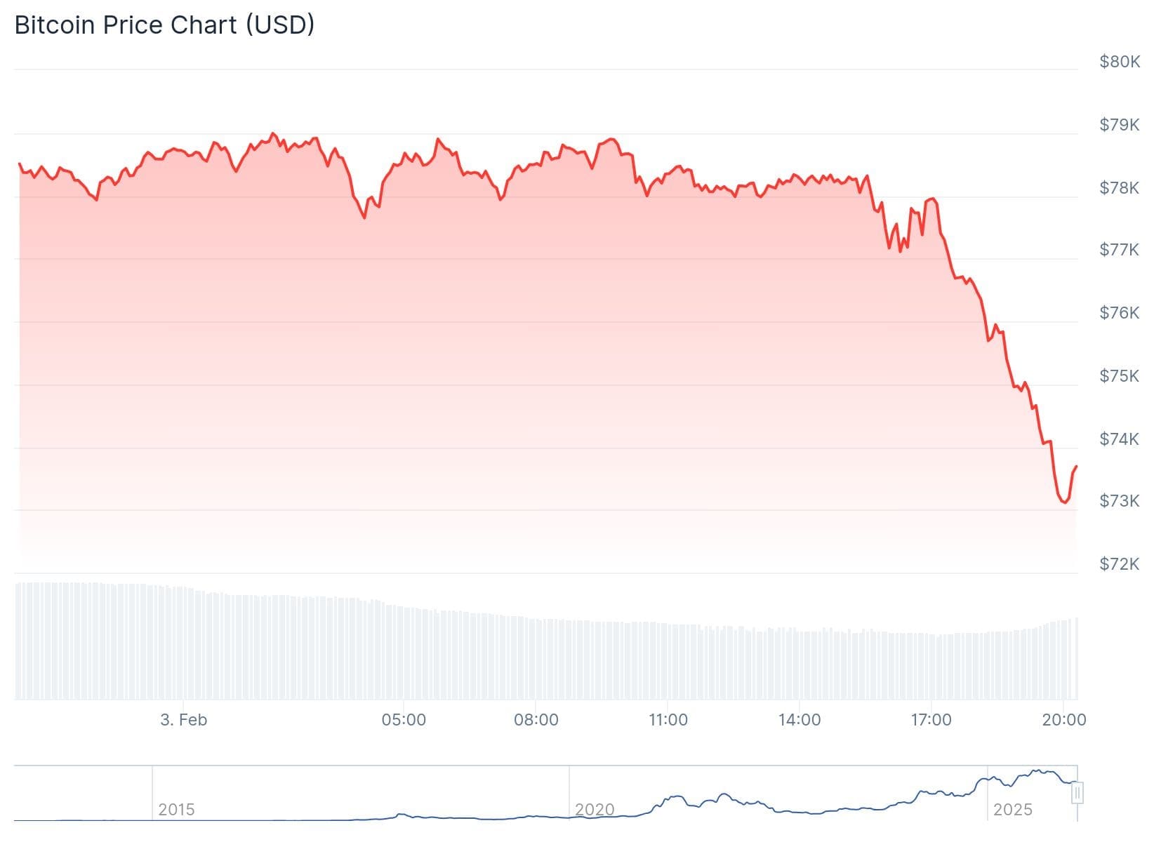 En trois heures, le cours du Bitcoin a chuté de plus de 6 %. À 17h00, il s’échangeait encore à 78 000 dollars, mais à 20h00, il était tombé à 72 900 dollars.