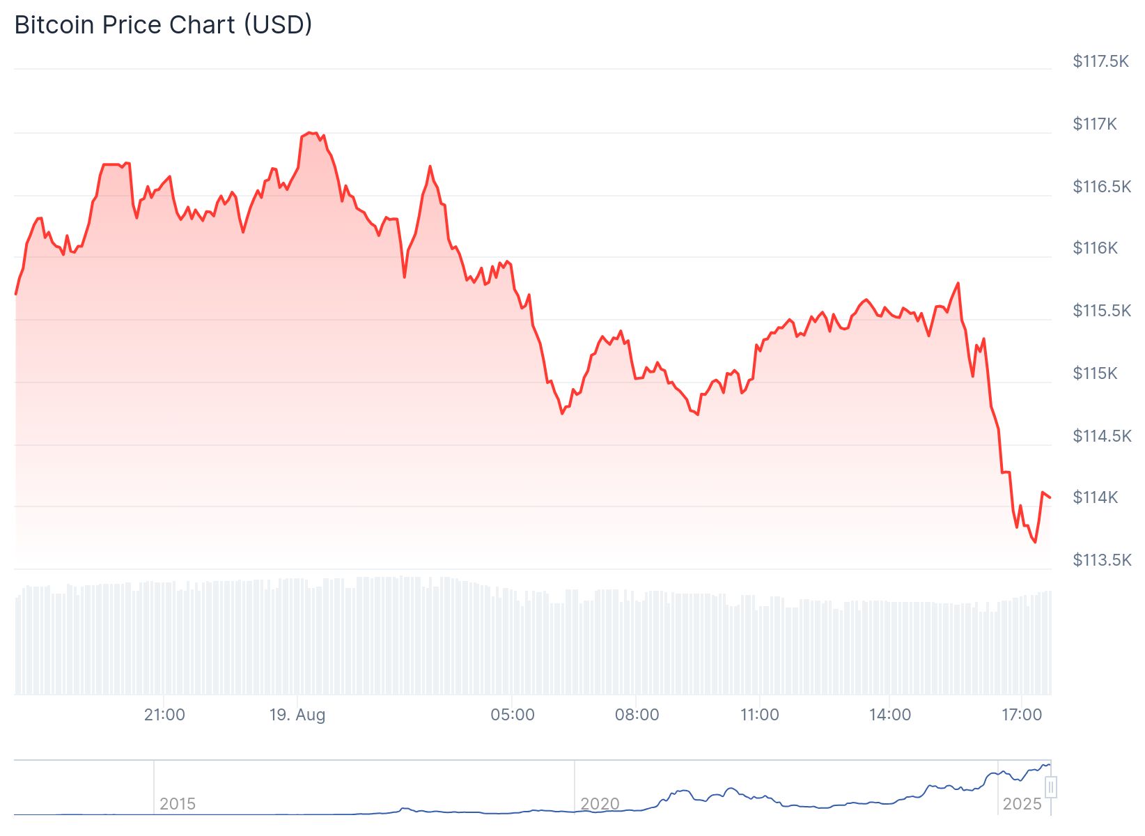 Ça ne s’arrête pas pour Bitcoin (BTC). Pour l’énième jour d’affilée, le cours continue de glisser. Cette fois, il s’agit d’une forte baisse qui fait passer le cours pour la première fois depuis des semaines sous les 114.000 dollars. Cela provoque beaucoup de peur sur le marché, et ce sont les altcoins qui en souffrent le plus pour le moment.