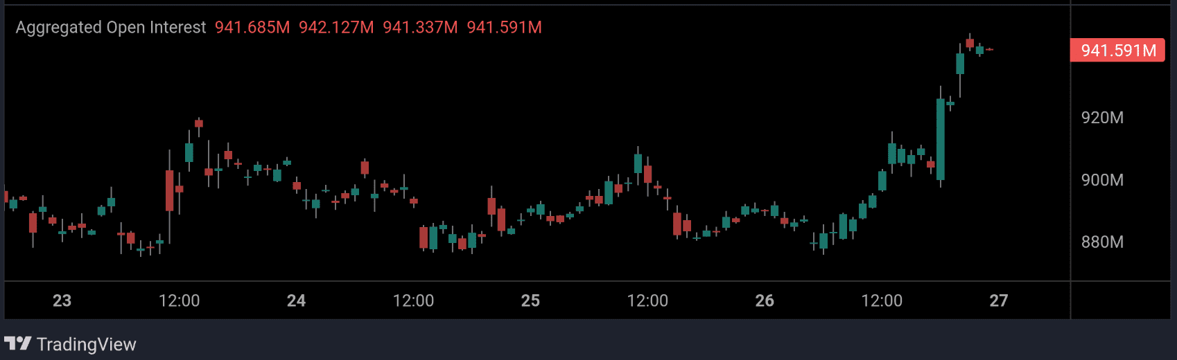 Ce qui rend cette baisse particulière, c’est que le nombre de positions ouvertes sur le marché augmente. L’open interest (OI) est passé d’environ 886 millions de dollars à près de 946 millions de dollars. Cela signifie que de plus en plus de traders ouvrent des positions, malgré la baisse du cours.