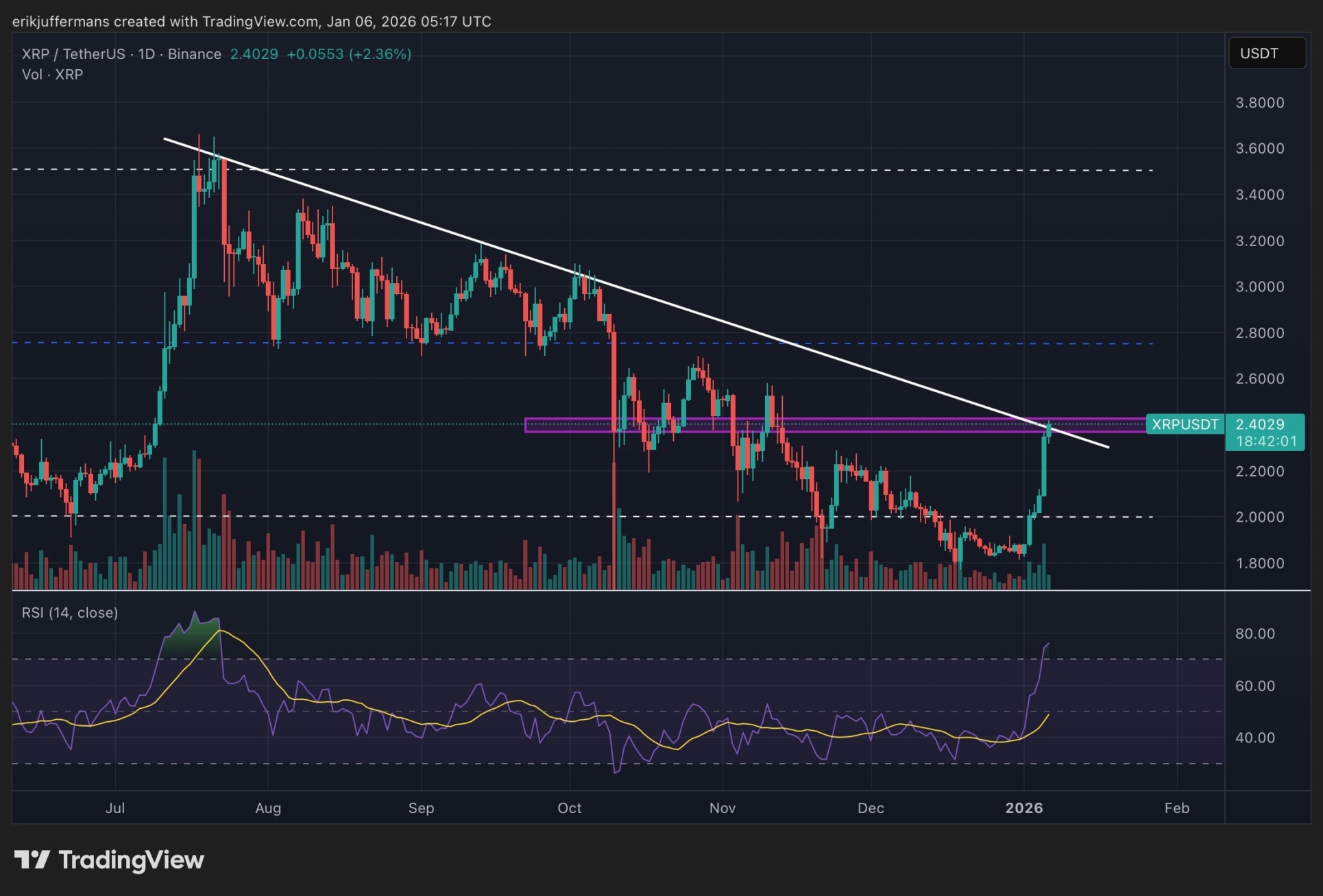 Depuis le début de l’année, le cours de l’XRP a littéralement explosé. Le 1er janvier, l’XRP s’échangeait encore autour de 1,80 dollar. Désormais, la monnaie atteint 2,40 dollars, un niveau déjà identifié par Juffermans comme un objectif de prix important. La question reste de savoir si l’XRP peut franchir cette résistance ou s’il va reculer.