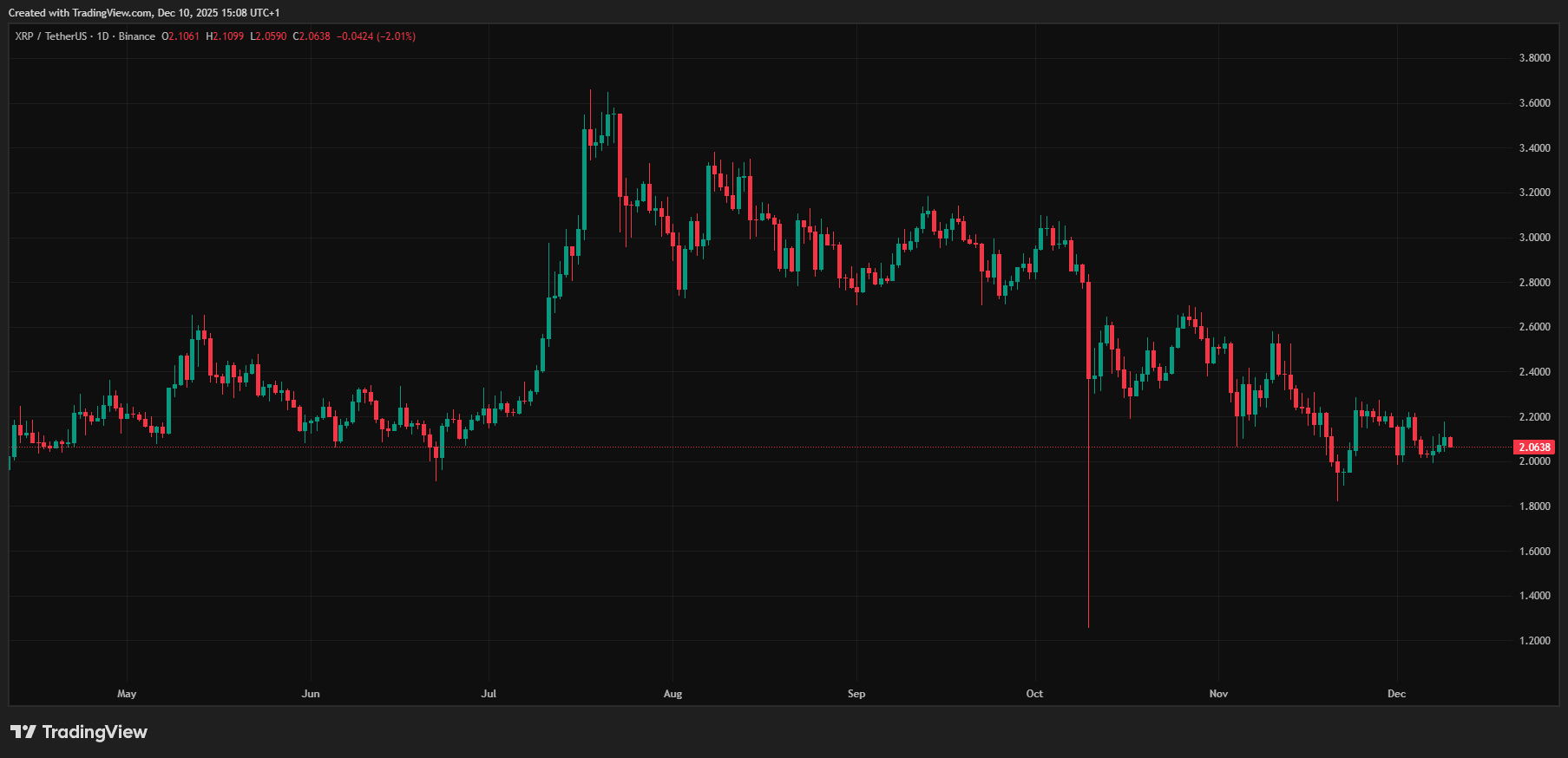 Cette prévision arrive à un moment particulier. Depuis que le XRP a atteint un nouveau sommet historique de 3,65 dollars en juillet, sa valeur a fortement chuté. Le cours est descendu en dessous de 2 dollars, a légèrement repris, mais se situe encore à 2,06 dollars, soit plus de 40 % en dessous de son pic. C’est ce contraste qui rend la prévision de Steingraber si frappante.