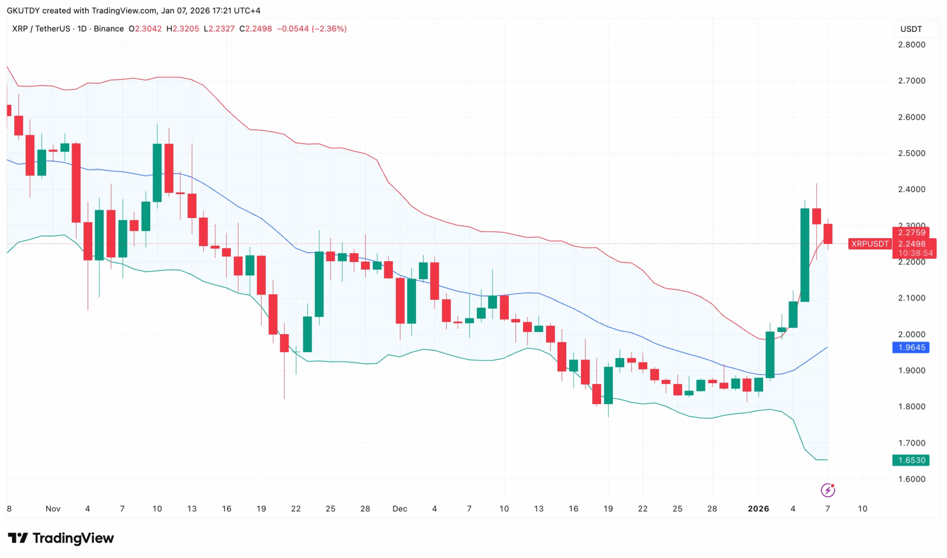 Sur le graphique hebdomadaire, XRP stagne sous la ligne médiane des bandes de Bollinger, actuellement autour de 2,43 dollars. Tant que le cours ne clôture pas nettement au-dessus, la tendance baissière depuis octobre reste le schéma dominant. La limite inférieure du canal est à 1,67 dollar, un niveau déjà testé le mois dernier.