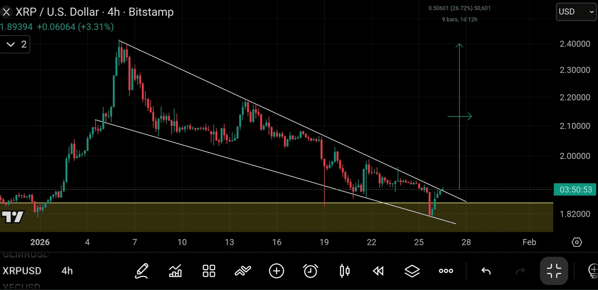 Le cours approche désormais le sommet du motif en coin, aux environs de 1,90 dollar. Si le XRP parvient à le franchir avec conviction, la montée pourrait être rapide. Selon l’analyse technique, la pression vendeuse diminue tandis que les acheteurs se préparent à intervenir.