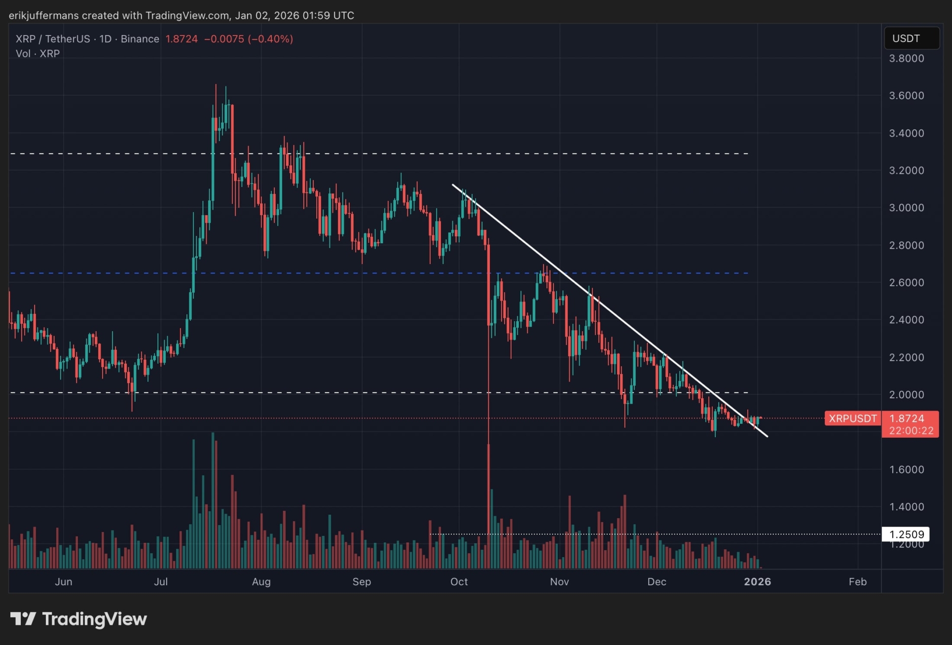 En 2025, le niveau de 2 dollars a servi à plusieurs reprises de solide soutien pour le cours du XRP. Mais le mois dernier, cela a mal tourné. Le XRP est tombé en dessous de cette limite et depuis, aucune reprise convaincante ne s’est matérialisée.