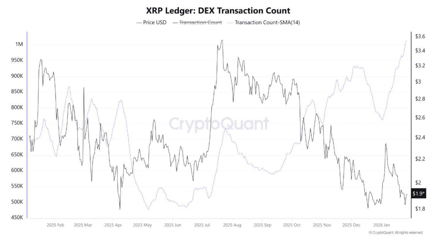 Selon des données de CryptoQuant, le nombre de transactions atteint son plus haut niveau depuis début 2025. De plus en plus d’utilisateurs utilisent le XRP pour des échanges et d’autres applications sur le réseau, ce qui indique une adoption croissante de l’écosystème XRP.