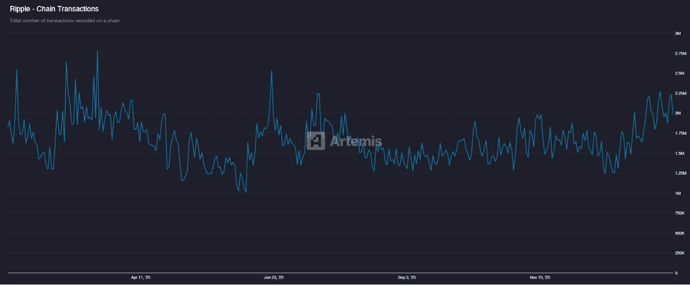Une telle augmentation montre que le réseau devient plus actif et que l’intérêt pour le XRP s’accroît. Lors des périodes précédentes, une hausse similaire des transactions précédait des mouvements de prix à la hausse, car une utilisation accrue génère souvent une demande supplémentaire pour le XRP.