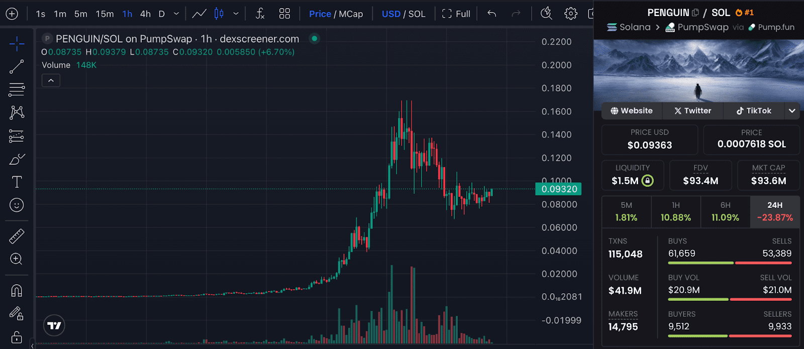 Avant la publication virale, PENGUIN avait une valorisation d’environ 18 millions de dollars. En 24 heures, celle-ci est montée à environ 136 millions de dollars, avec un prix d’environ 0,13 dollar par token. Durant cette même période, des centaines de millions de dollars en PENGUIN ont été échangés, témoignant de l’intérêt considérable qu’il suscitait.