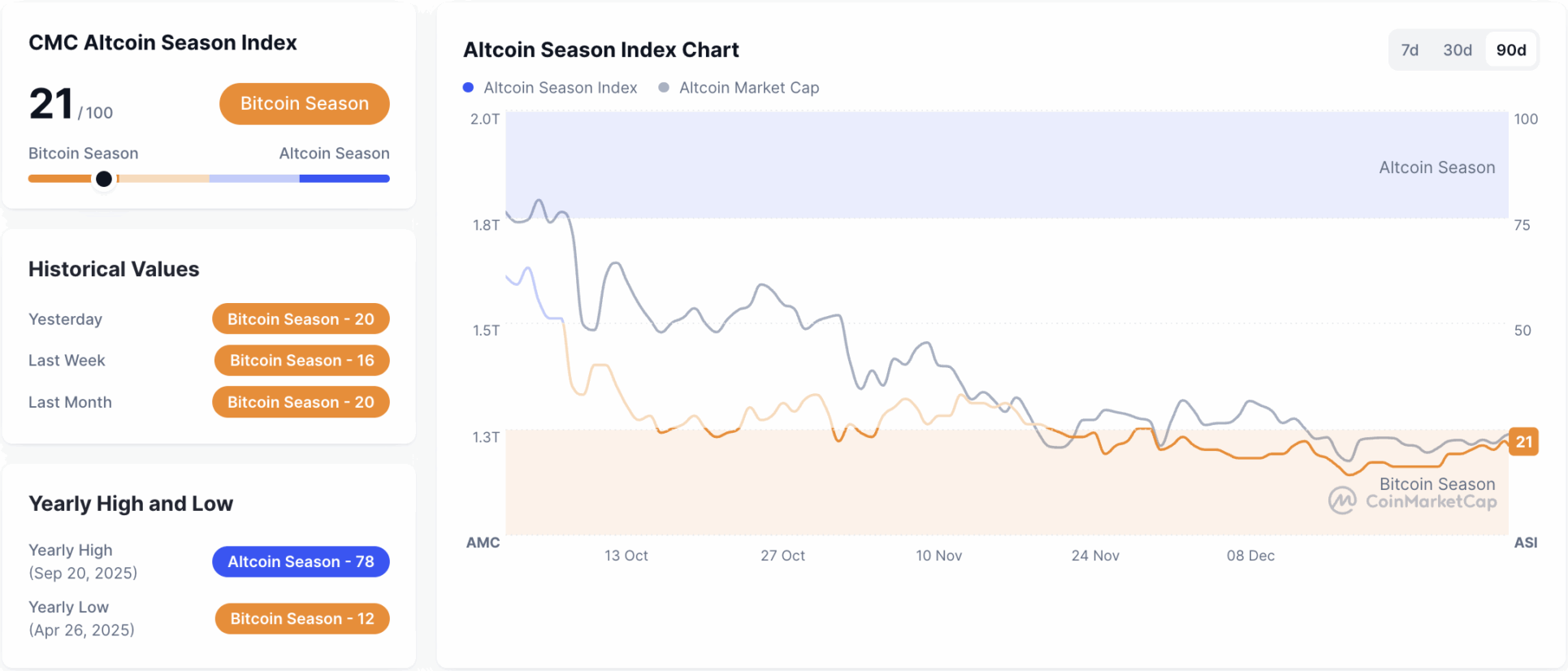 D’autres données de marché confirment que les investisseurs n’embrassent pas encore le risque. L’indice Altcoin Season de CoinMarketCap est à 23 sur 100, indiquant clairement une « saison Bitcoin ». Cela signifie que le capital reste principalement concentré sur Bitcoin et ne se dirige pas vers les altcoins.