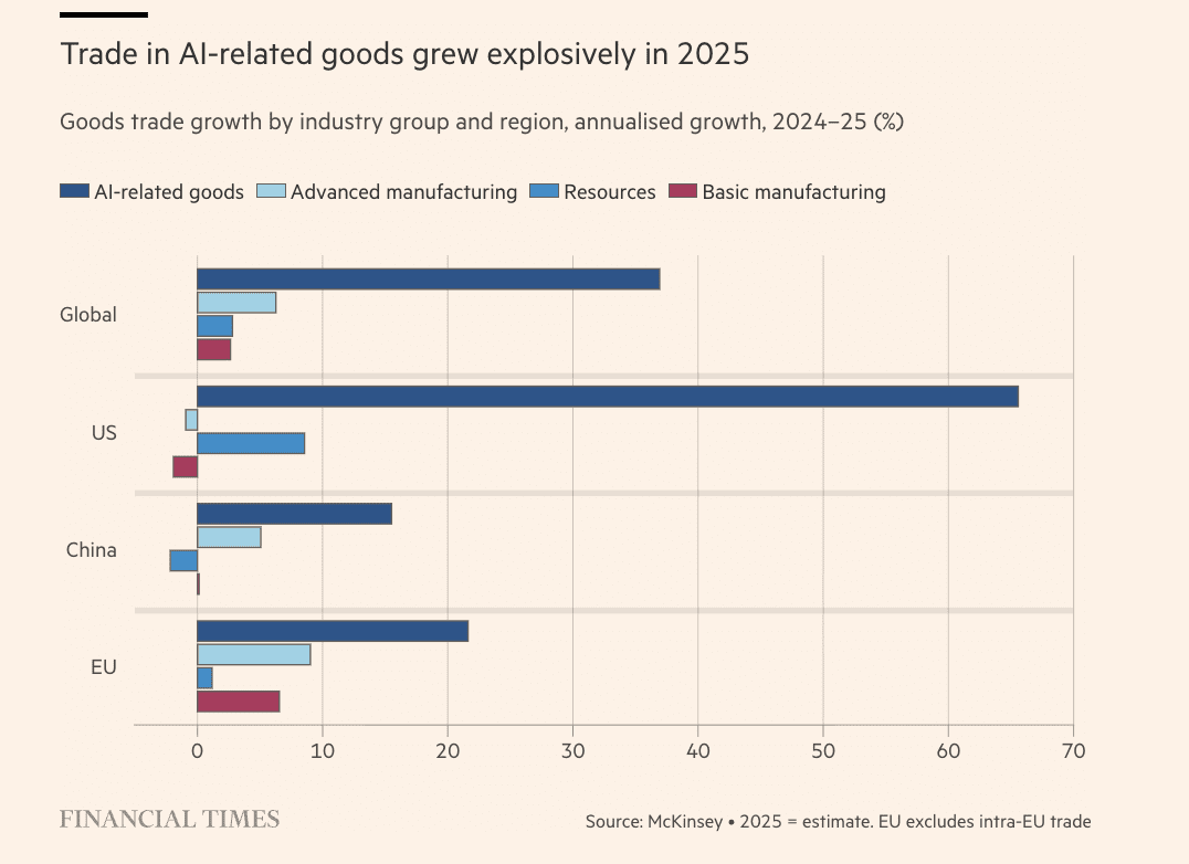 L’un des points clés de sa colonne est l’essor du commerce lié à l’IA. Wolf souligne que les expéditions de puces et d’équipements pour centres de données sont devenues l’un des principaux moteurs du commerce mondial.