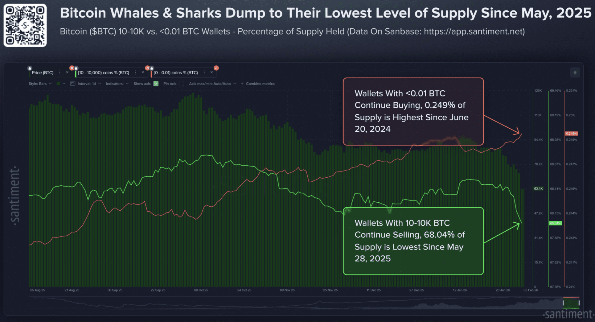 Les portefeuilles détenant entre 10 et 10 000 Bitcoin représentent désormais 68,04 % de l’offre totale. En seulement huit jours, 81 068 Bitcoin ont disparu de ce groupe. Durant la même période, le cours du Bitcoin est passé d’environ 90 000 dollars à environ 65 000 dollars, soit une baisse d’environ 27 %.