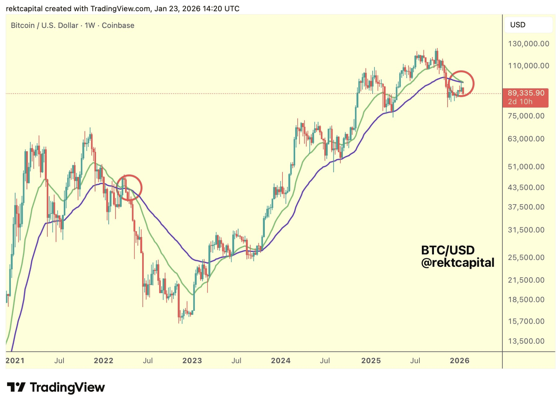 Cependant, tous les signaux ne sont pas rassurants. Techniquement, le Bitcoin présente des similitudes avec le début de 2022. Sur le graphique hebdomadaire, une rupture de tendance est à nouveau visible, avec des moyennes mobiles importantes qui se croisent à la baisse. Lors de cycles précédents, un tel schéma s’est parfois avéré être le début d’une période de faiblesse prolongée.