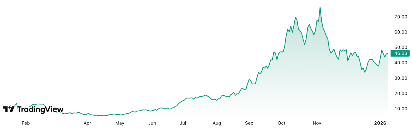 Parmi les gagnants les plus remarquables figurait IREN. Début 2025, l’action se négociait encore à 9,50 dollars. Peu après le record historique du Bitcoin à plus de 126 000 dollars, IREN a atteint presque 77 dollars, soit une augmentation de plus de 711 pour cent.