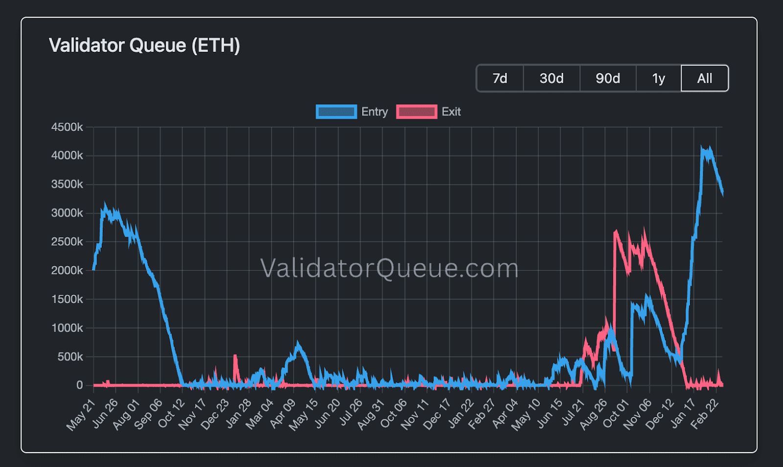 L’intérêt pour le staking est actuellement si fort qu’une longue file d’attente s’est formée. Selon ValidatorQueue, environ 3,4 millions d’ETH attendent pour devenir validateurs sur le réseau. Le mois dernier, ce nombre dépassait même les 4 millions d’Ethereum.
