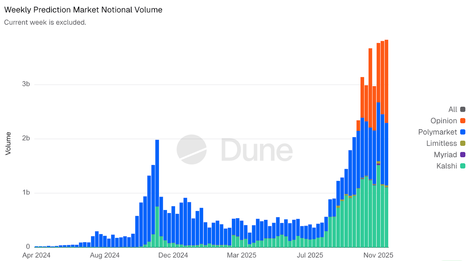 Les données récentes du marché montrent qu’en octobre, les marchés de prédiction ont généré un volume d’échanges de 7,5 milliards de dollars. À titre de comparaison, les meme coins ont atteint seulement 2,7 milliards de dollars et les NFT à peine 600 millions de dollars. En novembre, l’écart s’est encore creusé.