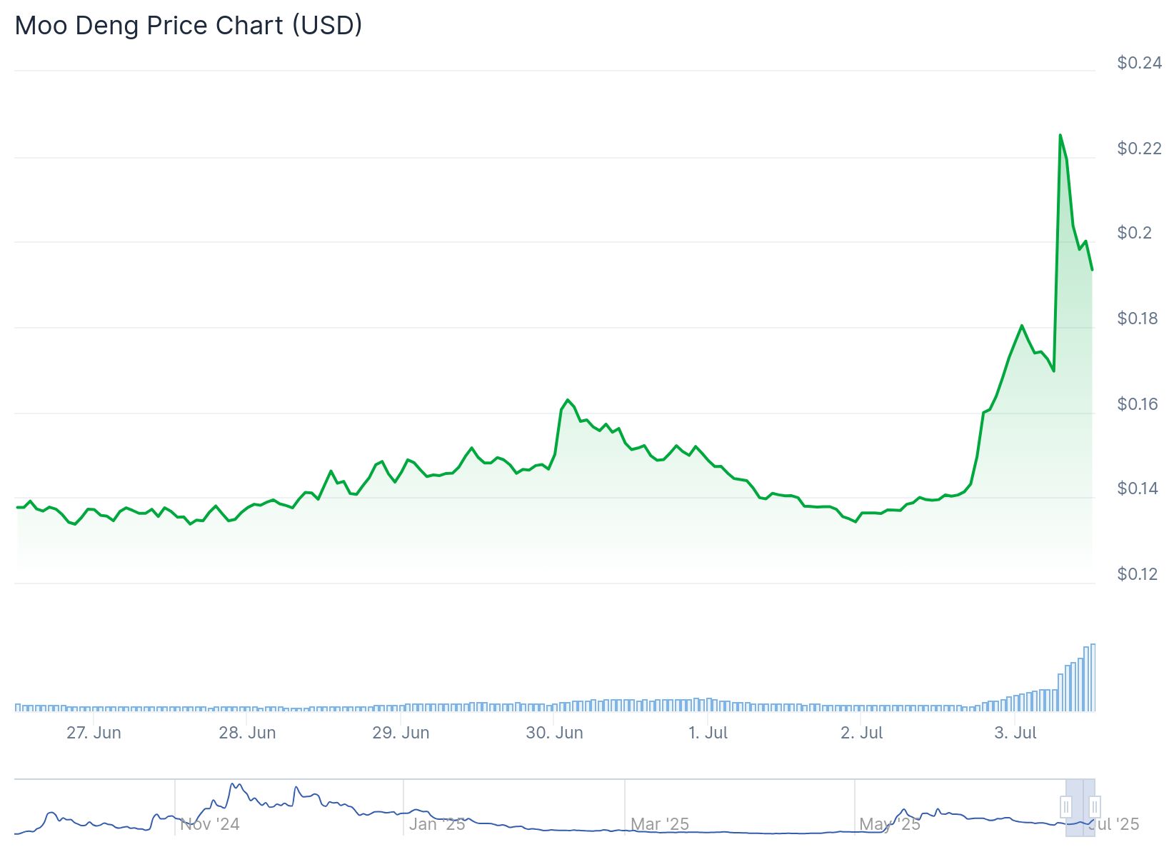 Mais le projet qui se démarque vraiment est Moo Deng (MOODENG). C’est aussi un memecoin sur le réseau Solana. Contrairement à de nombreux tokens ayant un chien comme mascotte, Moo Deng est basé sur un bébé hippopotame nain de Thaïlande du même nom qui est devenu viral en Asie.
