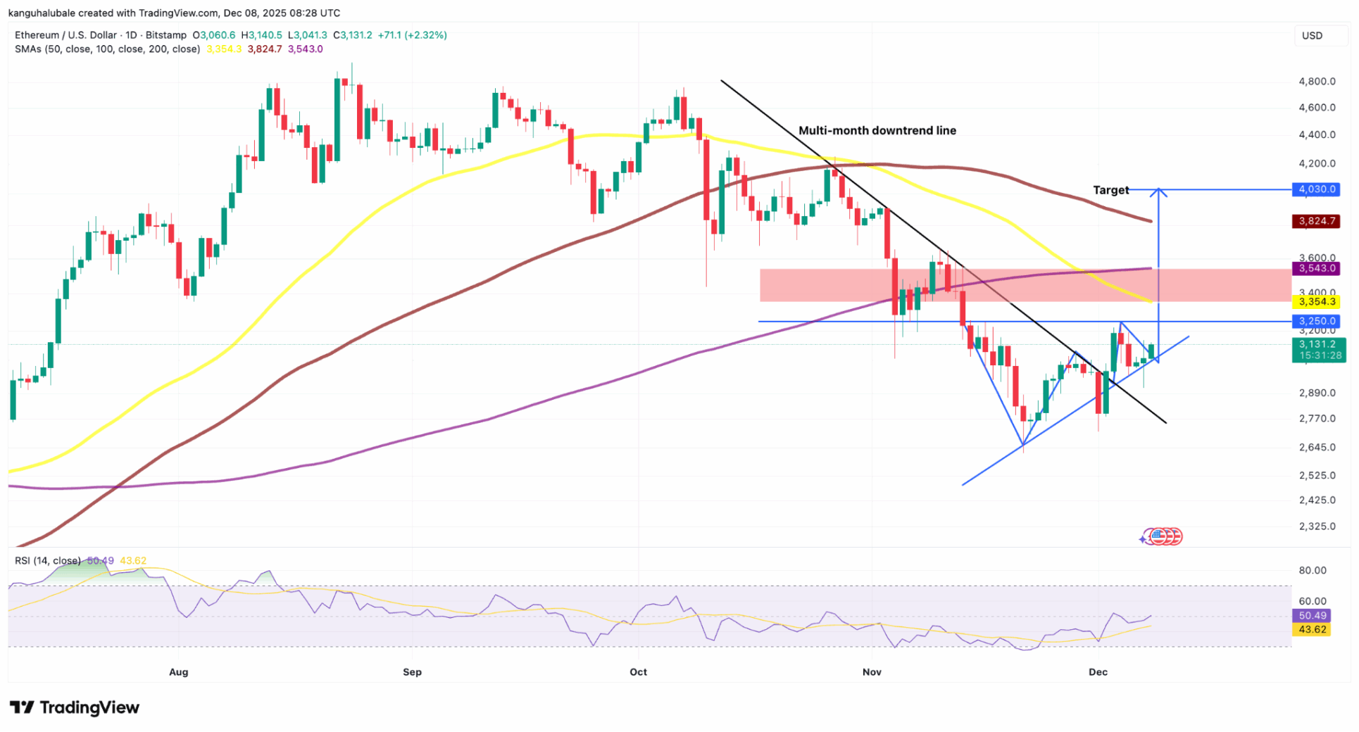 Ethereum se négocie actuellement autour de 3 140 dollars, soit plus de 20 % au-dessus du creux de 2 621 dollars du 21 novembre. Un triangle ascendant se dessine sur le graphique quotidien, un schéma qui, techniquement, laisse envisager une percée.