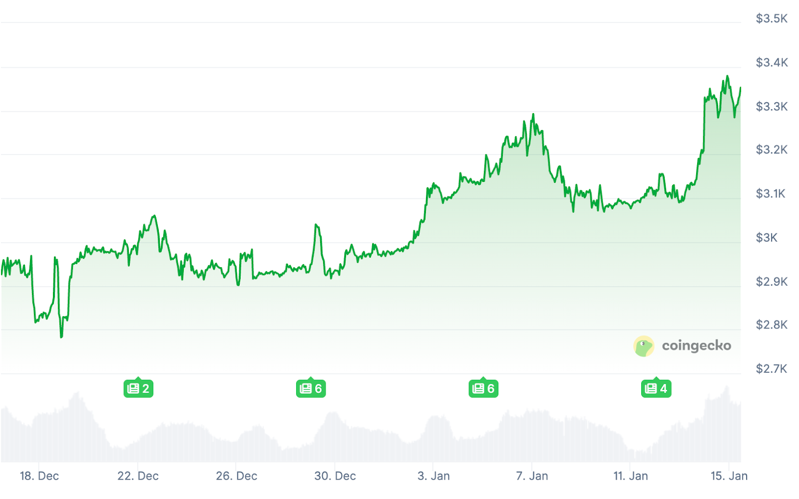 ETH enregistre actuellement une hausse de 7,6 % sur une base hebdomadaire, poursuivant ainsi sa tendance haussière amorcée en début d’année.