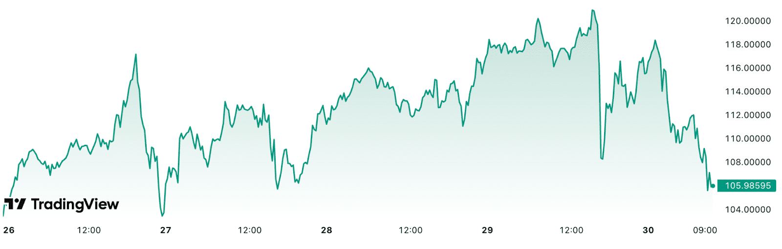 L’argent a également connu une hausse spectaculaire cette année. Son prix a triplé depuis janvier, atteignant hier un pic de 121,60 dollars par once. Cette valeur a depuis chuté à 107,50 dollars, en baisse de 11,6 %.