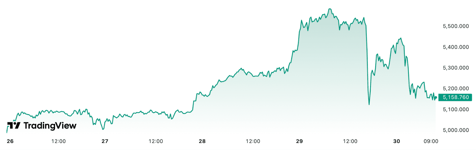 Depuis le 1er janvier, le cours de l’or a grimpé de plus de 31 % pour atteindre un sommet historique de 5 600 dollars par once (environ 31 grammes). Ce record a été atteint il y a seulement deux jours, mais l’or est désormais coté à environ 5 170 dollars, soit une perte de 7,7 % en quelques jours.