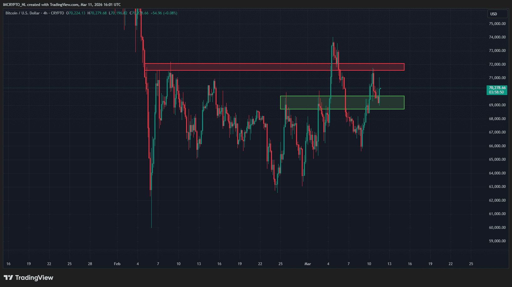 Bitcoin a trouvé un soutien dans la zone verte, où il avait été rejeté deux fois ces dernières semaines, ce qui est un signe positif. Cependant, le plus important est de casser la résistance rouge autour de 71 800 dollars. La semaine dernière, une tentative a eu lieu, mais il s’est avéré être une fausse rupture.