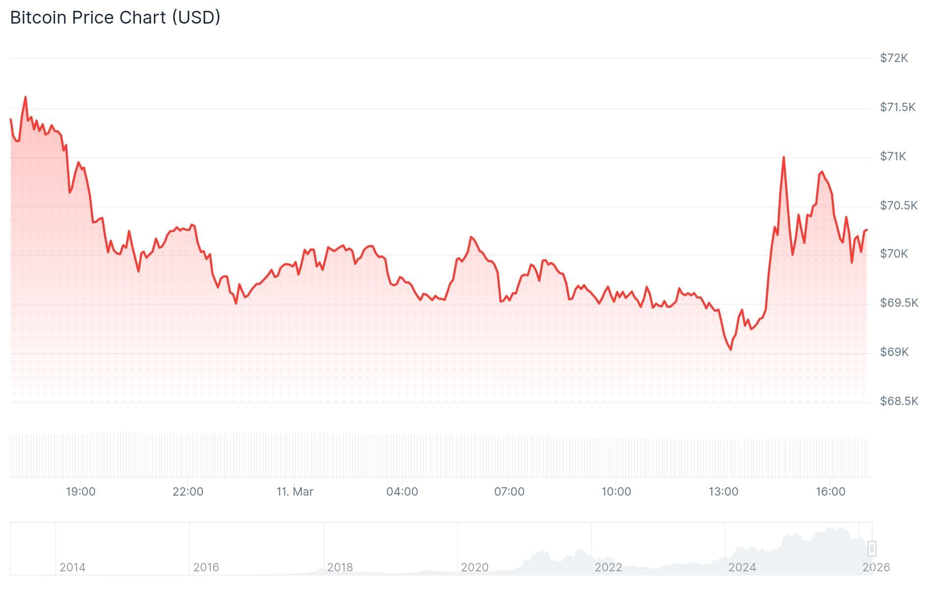 Le cours a d’abord chuté avant de se redresser, se stabilisant désormais au milieu. Bitcoin a débuté la journée autour de 70 000 dollars, est descendu à 69 000 dollars, a remonté à 71 000 dollars et est maintenant revenu à son niveau initial.