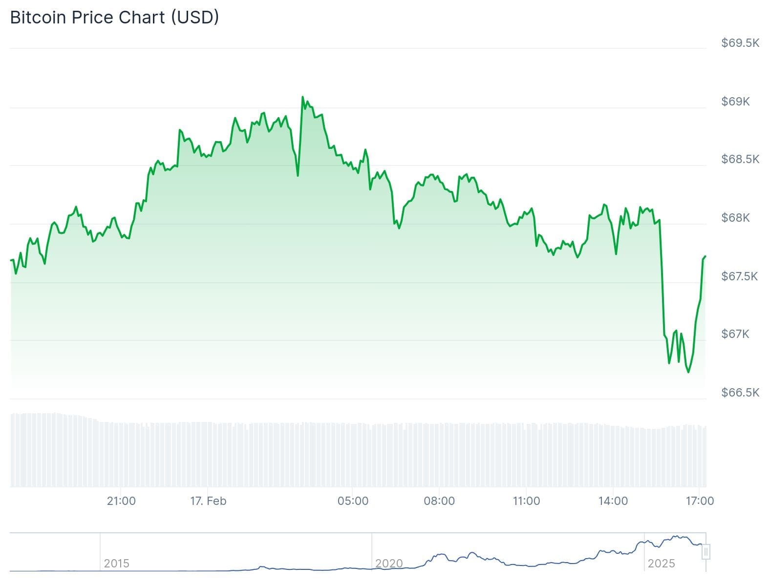Au moment de la rédaction, le cours du BTC s’élève à 67 697 dollars, soit une baisse de 0,15 % par rapport à il y a 24 heures. En euros, la plus grande cryptomonnaie se négocie actuellement à 56 926 euros.