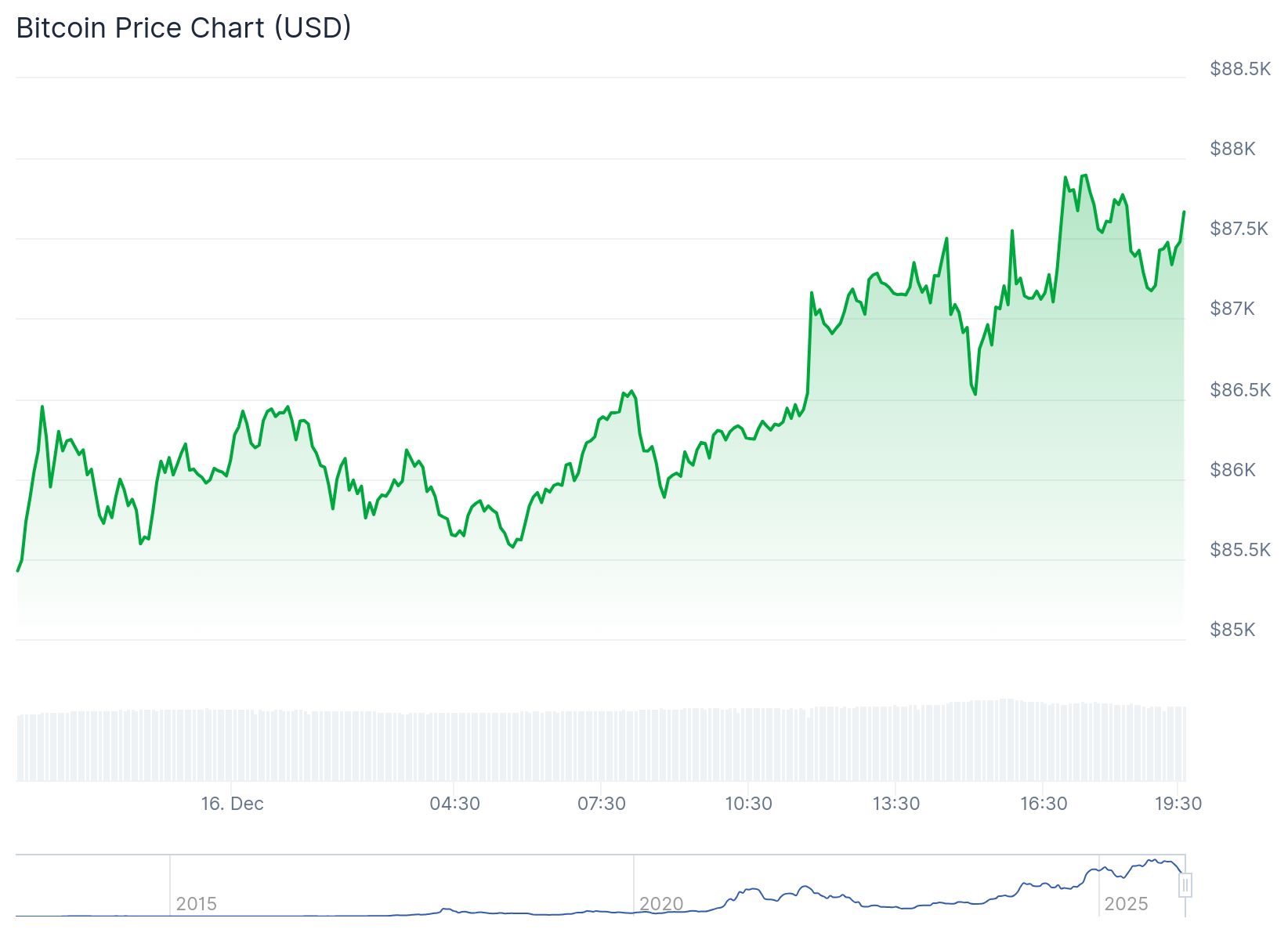 À 17h00, un plus haut provisoire de la journée a été atteint à 88 000 dollars. À ce moment-là, le cours affichait une hausse de près de 3,2 % par rapport au point bas évoqué ce matin.