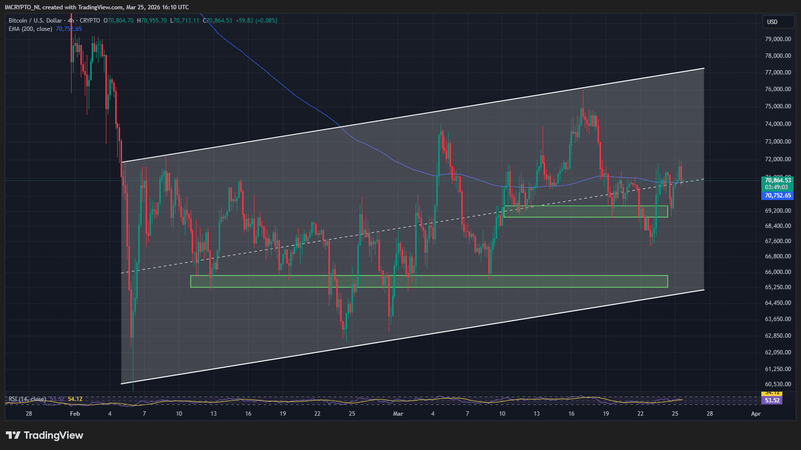 Sur le graphique en quatre heures, on constate que le cours du Bitcoin se maintient au-dessus de la moyenne exponentielle sur 200 périodes, actuellement autour de 70 750 dollars. Il se situe également au niveau de la ligne médiane du canal haussier dans lequel il évolue depuis le début du mois dernier.