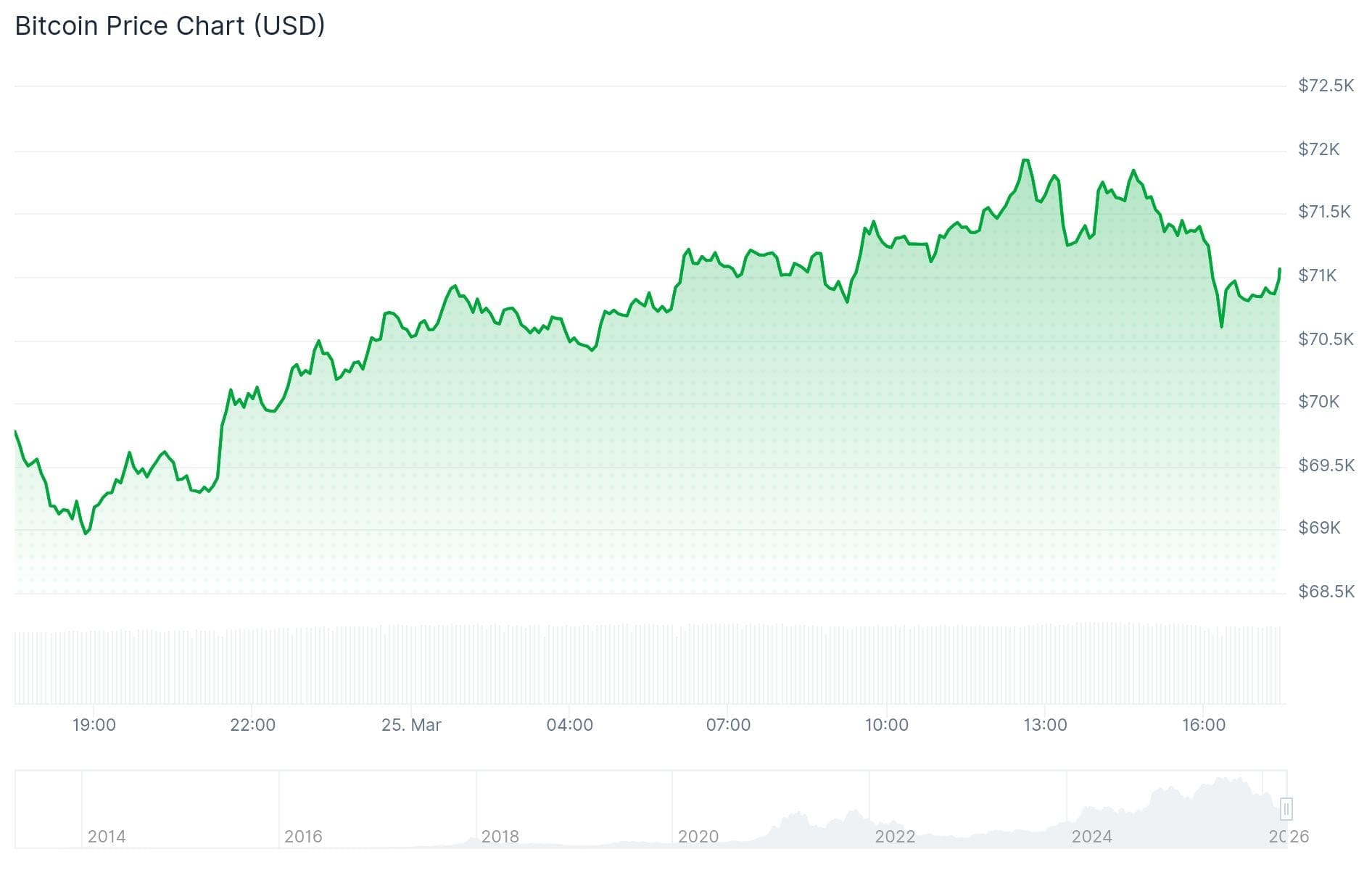 Le cours du Bitcoin a connu une forte hausse depuis le creux de 69 000 dollars atteint hier en début de soirée. Aux alentours de 12h30, il a atteint un sommet de 72 000 dollars, soit une augmentation de 4,3 %. Par la suite, il a légèrement baissé.