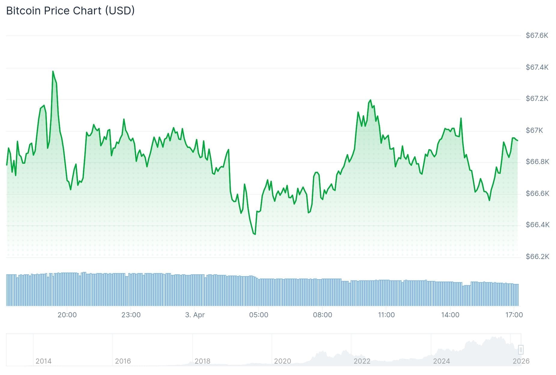 Au moment de la rédaction, le cours du BTC est de 66 935 dollars, en hausse de 0,06 % par rapport à il y a 24 heures. En euros, le plus grand crypto se négocie à 58 090.