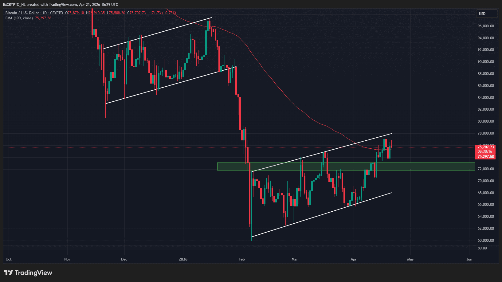 Désormais, le cours est repassé sous la barre des 76 000 dollars. Selon l’analyste Cheds Trading, un « niveau clé » a été franchi. Mais la bonne nouvelle est que Bitcoin se maintient provisoirement au-dessus de la moyenne des 20 périodes de 75 600 dollars.