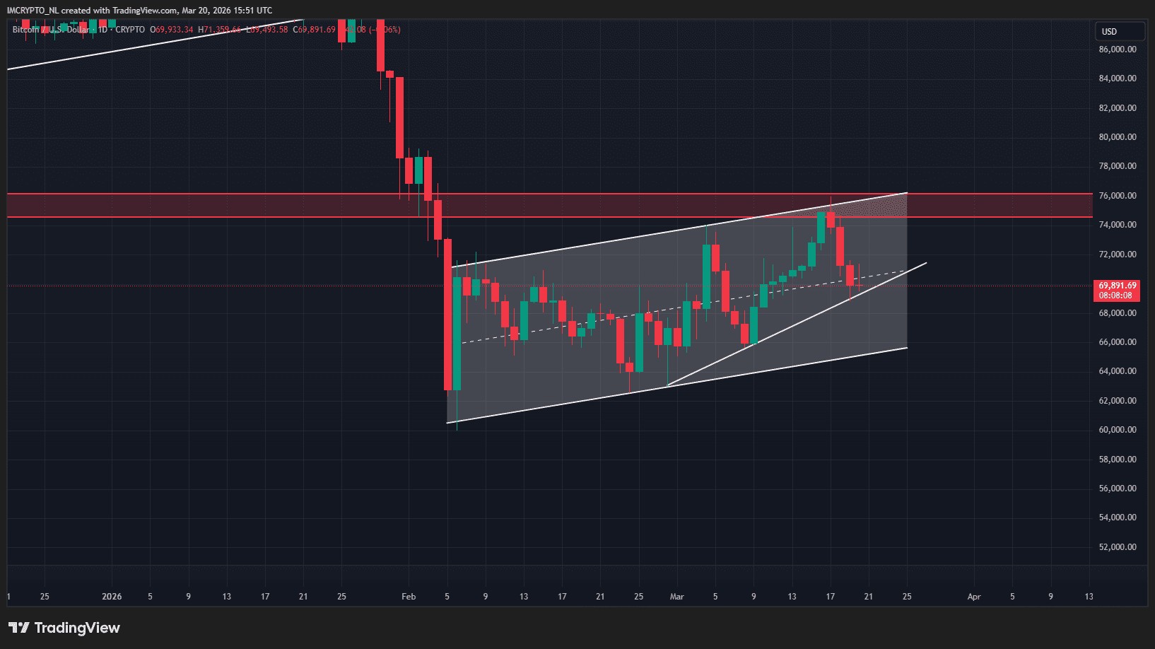 En examinant le graphique quotidien, on constate que Bitcoin se trouve actuellement sur un terrain glissant. Si le cours passe sous la ligne blanche diagonale, une nouvelle chute vers 65 000 dollars est à prévoir.