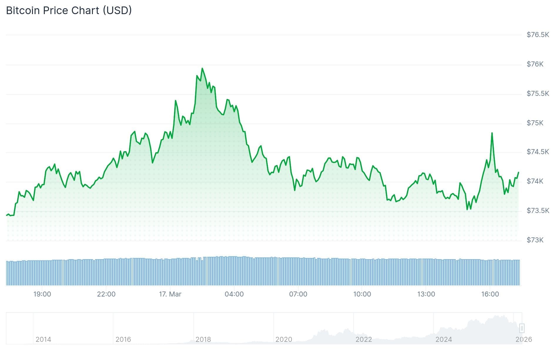 Cette nuit, un pic a été atteint à 76 000 dollars, le niveau le plus élevé depuis le 4 février. Mais depuis ce matin, le cours oscille autour de 74 000 dollars.