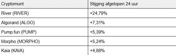 XRP se distingue avec une hausse de 3,84 %. La plus petite cryptomonnaie River (RIVER) joue le rôle principal avec une montée de 25,38 %. Cette monnaie, qui n’existe que depuis deux mois, a déjà vu sa valeur augmenter de plusieurs milliers de pourcents.