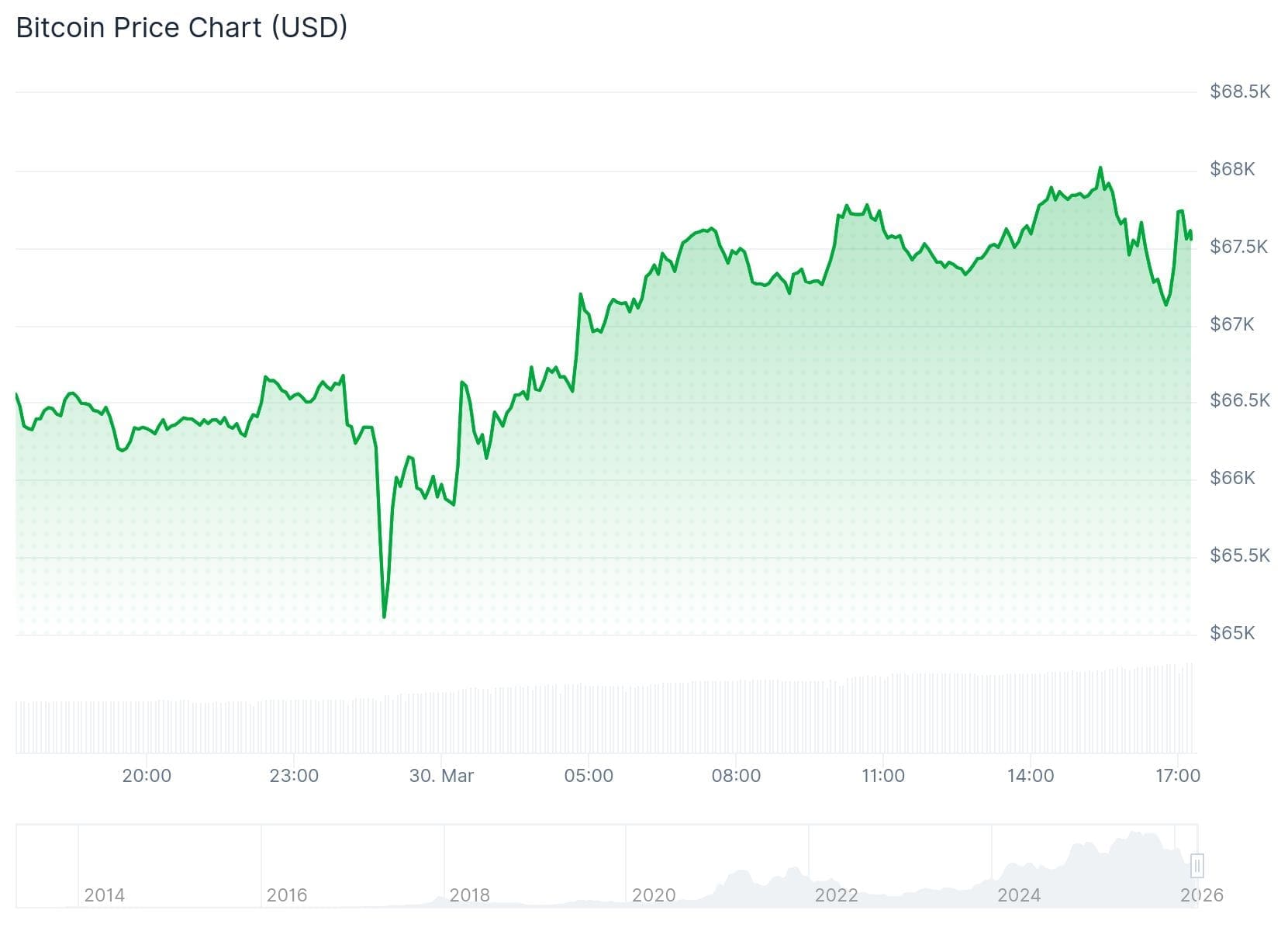 Cette nuit, le cours du Bitcoin a enregistré une forte hausse. Peu après minuit, il a atteint son niveau le plus bas depuis le 28 février à 65 000 dollars, mais vers 7 heures, il était déjà remonté à 67 600 dollars.