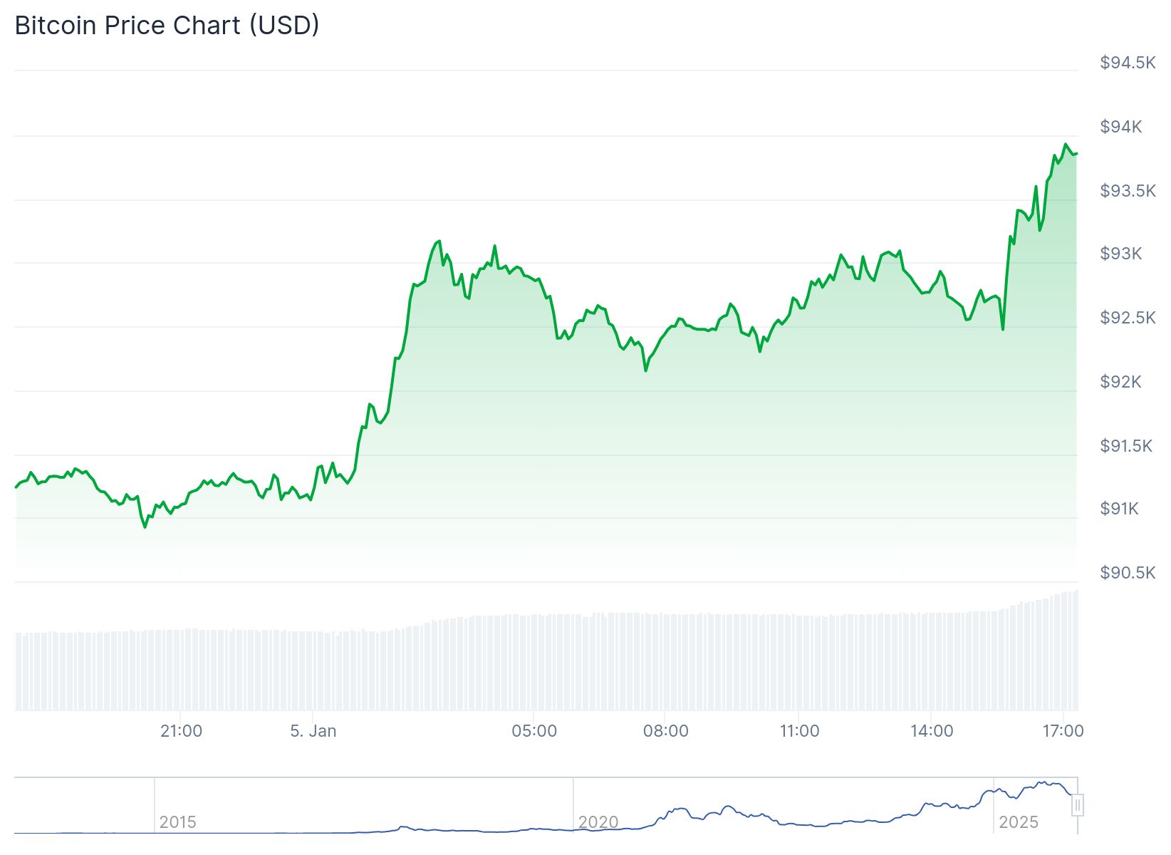 Ces dernières heures, Bitcoin a accéléré, comme il l’avait fait la nuit dernière. La cryptomonnaie orange a de nouveau franchi les 94 000 dollars, un niveau qui n’avait pas été atteint depuis le 10 décembre.