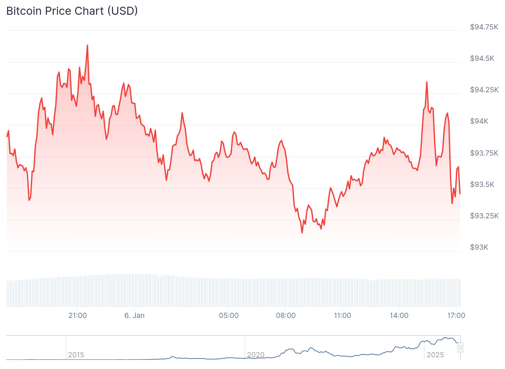 Le cours de Bitcoin a ouvert la journée à environ 93 800 dollars et se situe maintenant plusieurs centaines de dollars en dessous. À différentes reprises, la bougie a tout de même affiché du vert. Vers 15h30 cet après-midi, le point culminant a été atteint à 94 350 dollars, légèrement en dessous du pic d’hier à 94 750 dollars.