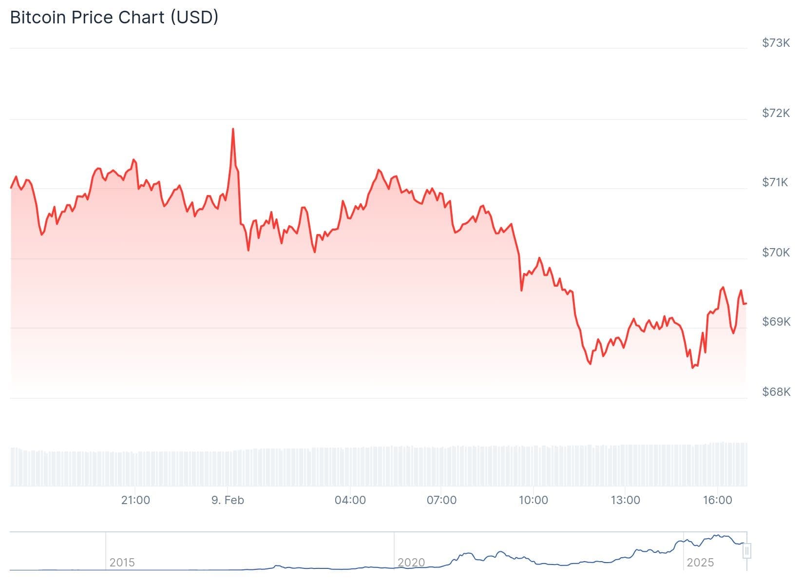Bitcoin a rebondi deux fois à partir d’environ 68 500 dollars et se négocie actuellement environ 1 000 dollars au-dessus de ce niveau. Du plus haut au plus bas, le cours a enregistré une baisse de près de 5 %.