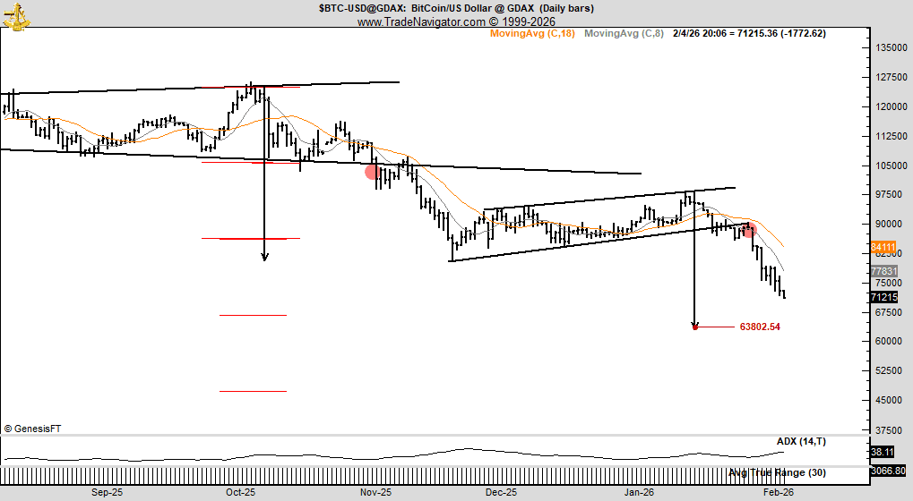 En une semaine, le Bitcoin a chuté de près de 20 %, passant sous la barre des 67 000 dollars. Ainsi, presque tous les gains des quinze derniers mois ont disparu. Ce qui est notable, c’est l’absence de véritable reprise. Selon le trader expérimenté Peter Brandt, cela n’est pas un hasard.