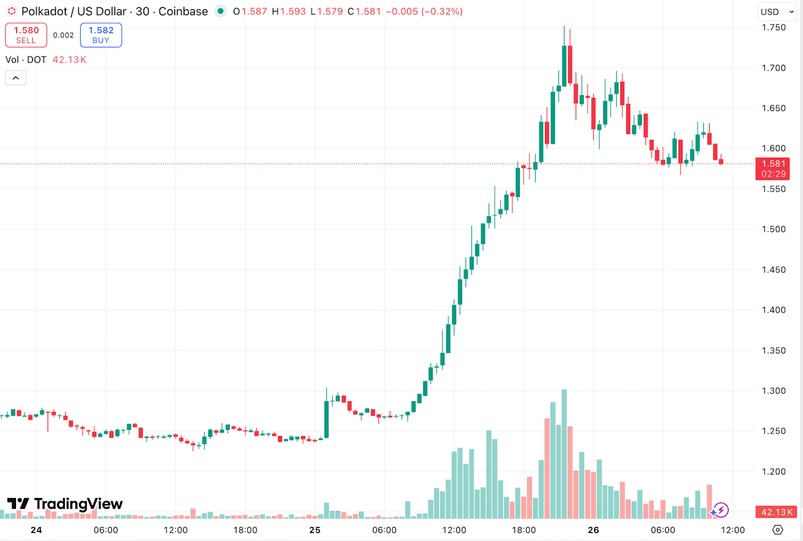 Depuis, le cours a légèrement baissé. Au moment de l’écriture, le DOT se situe autour de 1,59 dollar. Cela reste une reprise notable, surtout après la période de faiblesse qui l’a précédée.