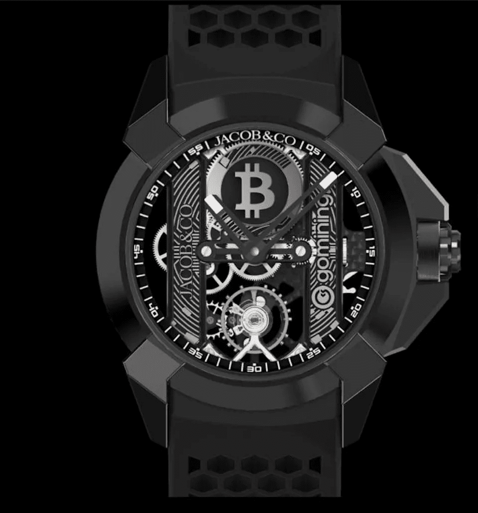 La montre résulte d’une collaboration entre l’entreprise de minage de Bitcoin GoMining et le fabricant de montres de luxe Jacob & Co. Il s’agit de l’Epic X GoMining, une montre mécanique associée à une véritable production de Bitcoin. Non par une puce intégrée, mais via une connexion numérique avec de grands centres de données.
