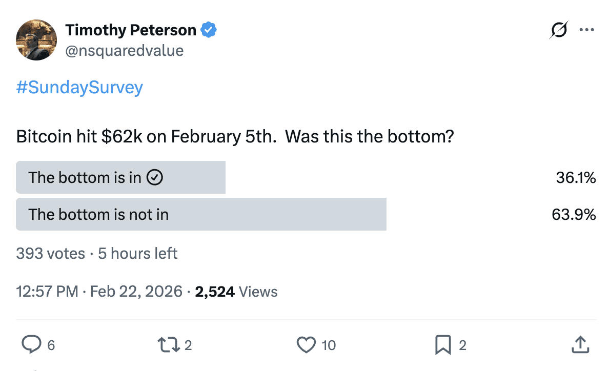 Ainsi, plus de 60 % des participants à un sondage publié par Peterson estiment que le Bitcoin atteindra encore un point bas inférieur. Pour l’instant, le point bas se situe autour de 60 000 dollars.