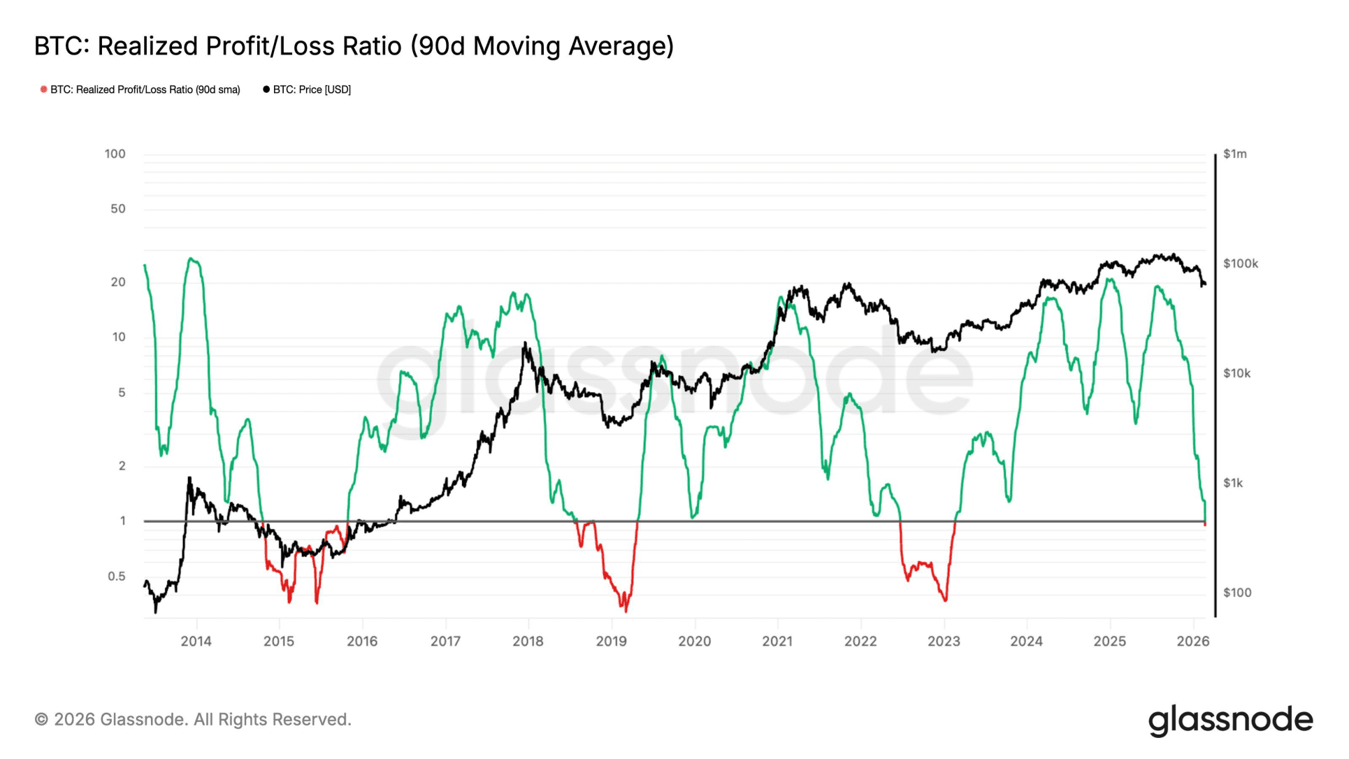Selon les données de Glassnode, le Realized Profit/Loss Ratio (90D-SMA) est un indicateur essentiel pour déterminer la phase de marché dans laquelle se trouve Bitcoin.