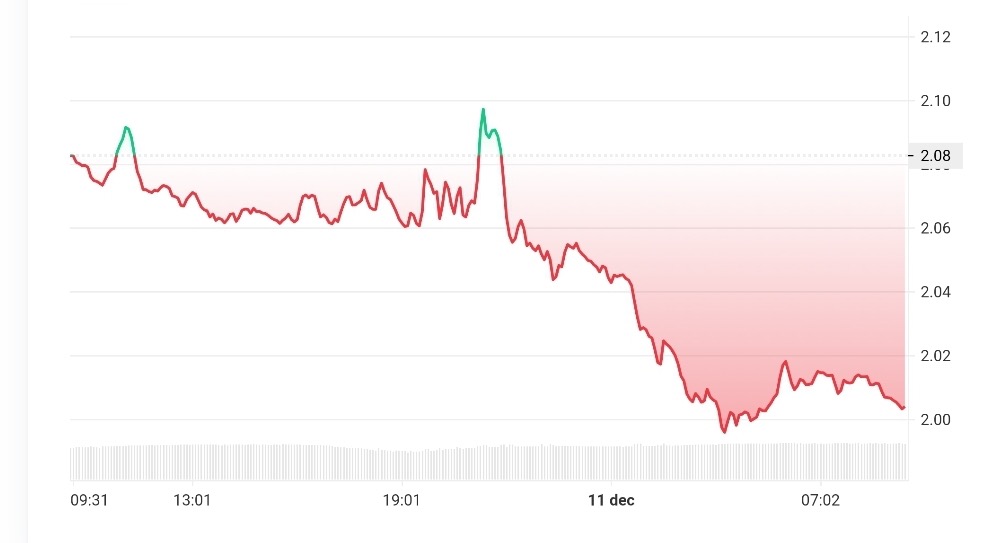Mercredi soir, le XRP a presque touché la résistance de 2,10 dollars, mais s’est arrêté à 2,09 dollars. À ce stade, les traders ont massivement converti leurs gains en ventes, entraînant une forte baisse vers le niveau de support important de 2 dollars. Le prix a chuté de plus de 4 pour cent, tandis que le volume des échanges a soudainement dépassé de 205 pour cent la moyenne journalière. La monnaie évolue toujours dans un schéma de compression avec des marges de plus en plus réduites, ce qui accroît la pression sur le cours.