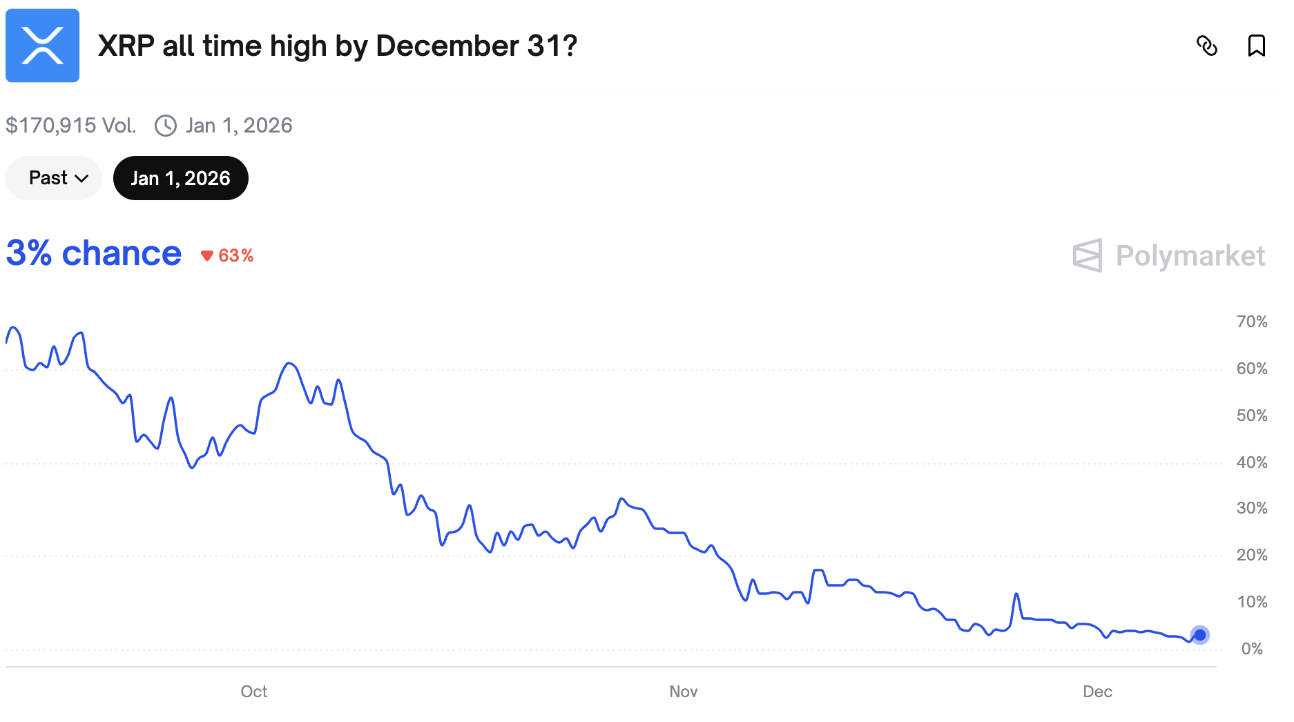 Sur la plateforme de cryptomonnaie Polymarket, où les traders misent de l’argent réel sur des scénarios futurs, la confiance dans le XRP s’est effondrée. La chance que la monnaie atteigne un sommet historique avant le 31 décembre 2025 ? Seulement trois pour cent.