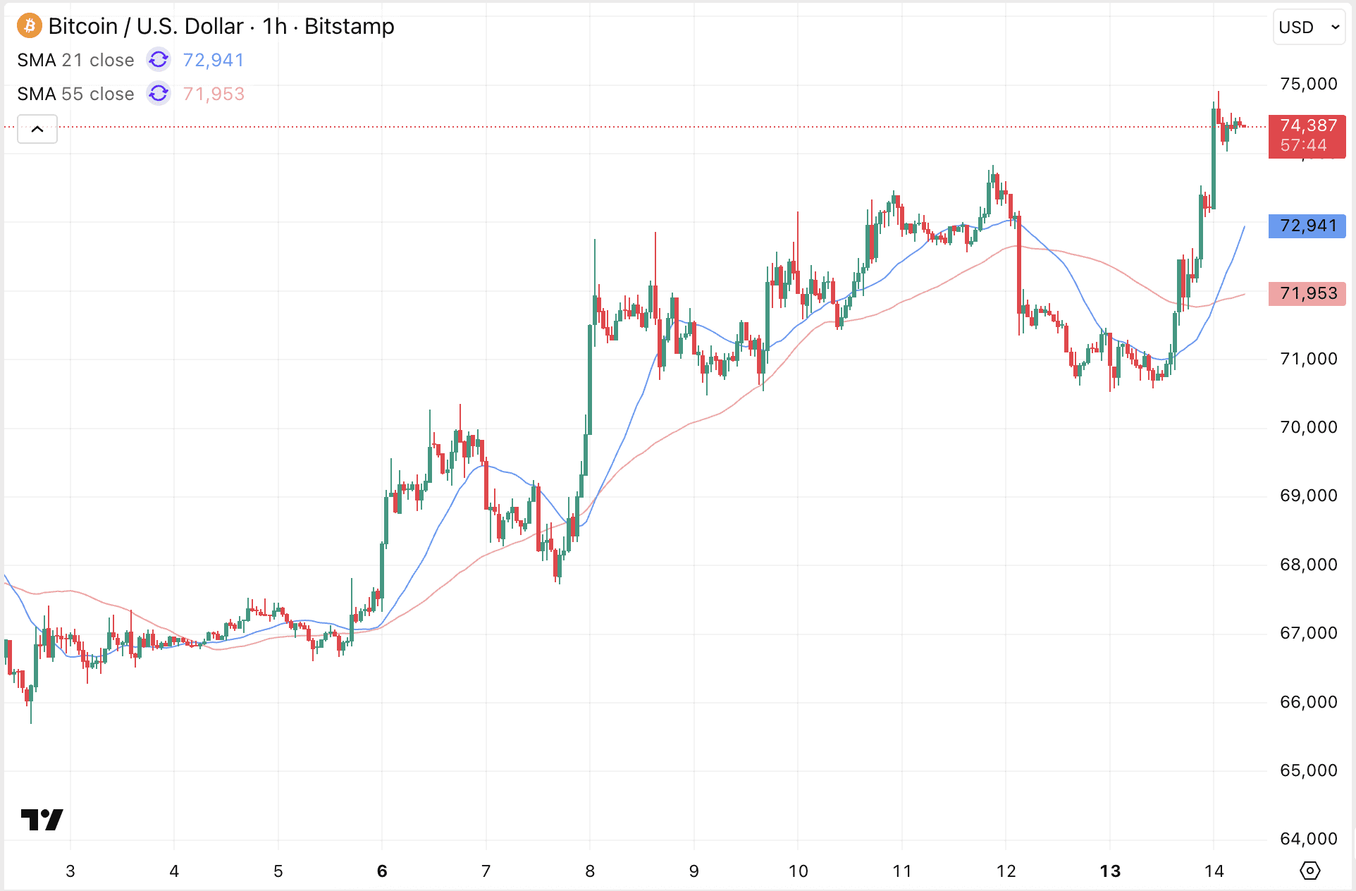 Le cours du Bitcoin a considérablement augmenté aujourd’hui, affichant actuellement une hausse de près de 5 % par rapport à 24 heures plus tôt. Bitcoin renforce ainsi une période de croissance amorcée depuis le creux de février à 60 000 dollars. Bitcoin se situe désormais environ 25 % au-dessus de ce niveau, bien que le conflit en Iran ne soit pas encore terminé.