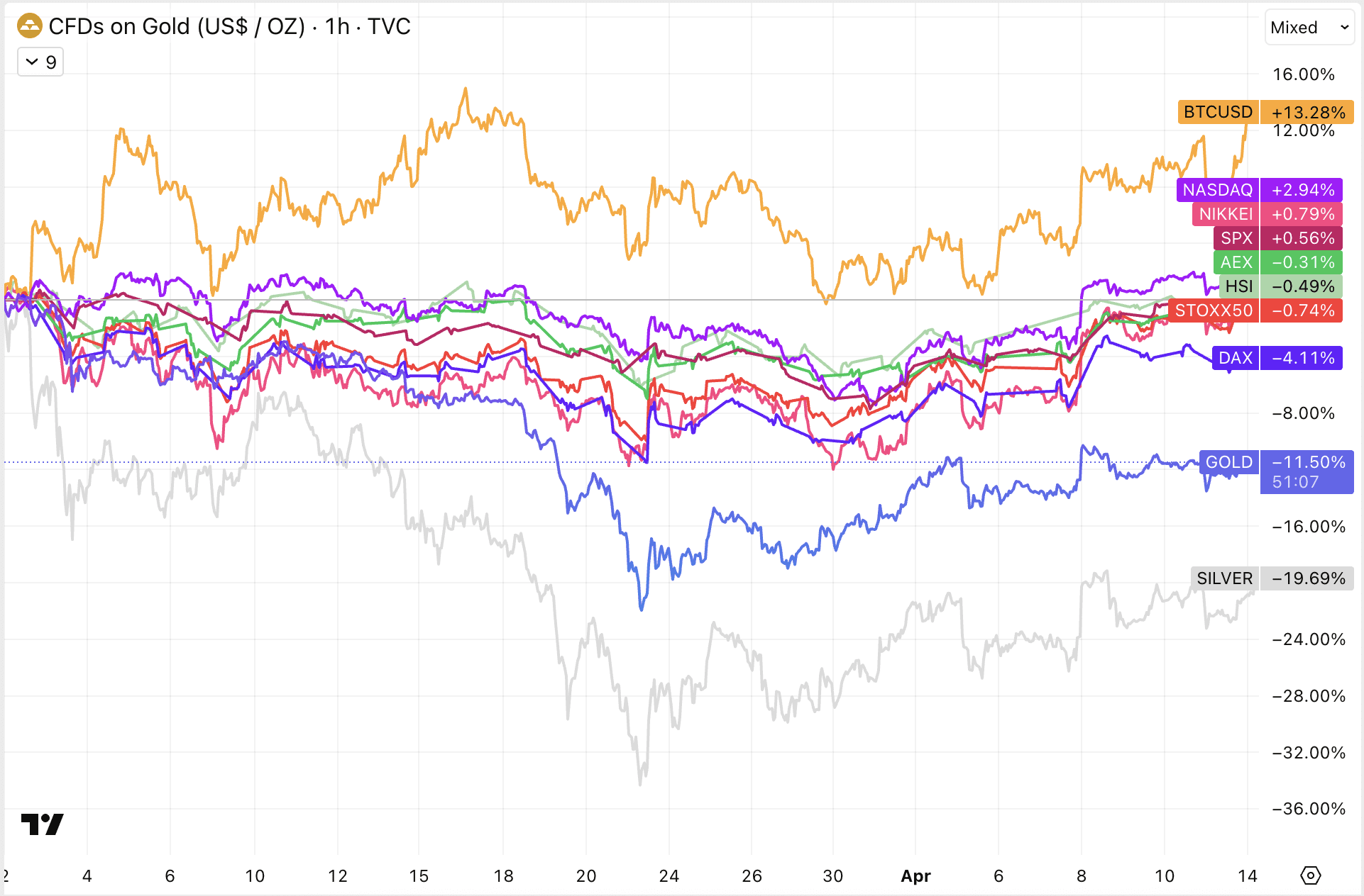 L’or et l’argent, cependant, sont les plus grands perdants. Au plus bas, l’argent a perdu plus de 30 %, tandis que l’or a enregistré une baisse de plus de 20 %. Bien qu’ils aient tous deux quelque peu rebondi, Bitcoin reste clairement le gagnant depuis le 28 février.