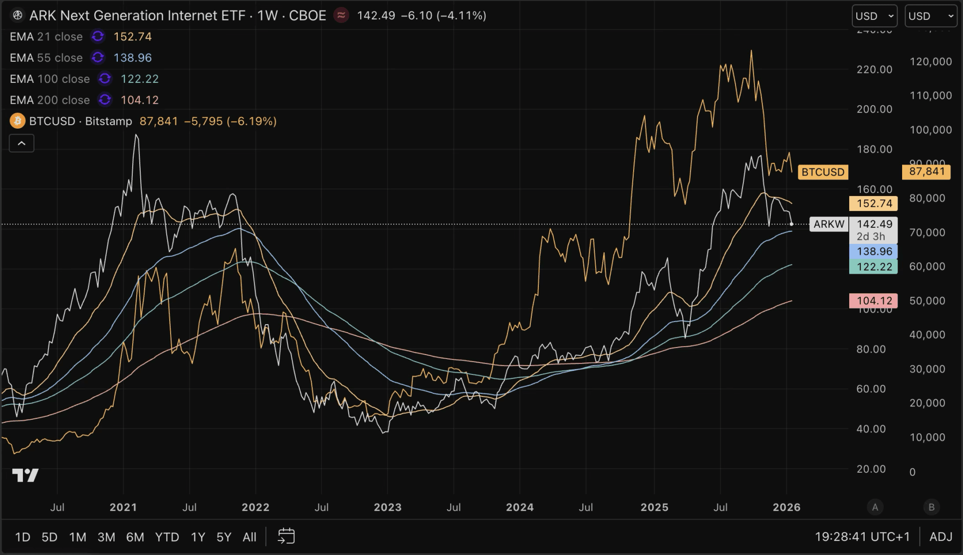 Actuellement, il y a simplement un manque d’appétence pour le risque extrême dont le Bitcoin a habituellement besoin pour performer. Cela se reflète, par exemple, dans les performances de l’ETF ARK Next Generation Internet (ARKW). Il s’agit d’un ETF axé sur des entreprises d’avenir qui doivent encore faire leurs preuves, et qui ne performe généralement que lorsque les investisseurs osent vraiment prendre des risques.